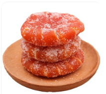 其风味甜润柔和,完美融合了柑橘天然的清新果酸与冰糖的醇厚甘甜,口感软韧有嚼劲,橘香馥郁。糖桔饼不仅是广受欢迎的茶点零食,也因柑橘本身有理气化痰之效,常被视作一款兼具美味与温和食疗价值的传统小食,在江南及岭南地区尤为常见。